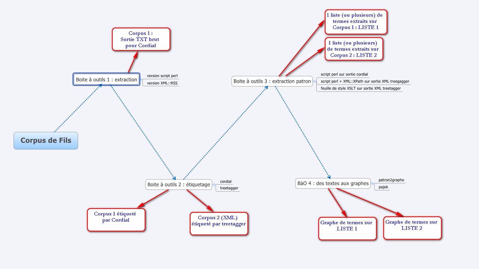 Pour le projet on travaille sur l'ensemble des fils RSS disponibles sur le site du journal Le Monde (pour le récupérer, cliquer ICI). Ce projet fait partie du cours Projet Encadré de Master 1 de TAL à Paris III, dirigé par le professeur, Monsieur Serge FLEURY. On a divisé le projet en 4 Boîte à Outils. D'abord on va extraire le contenu textuel de nos archives, et les stocke en format TXT et en XML.Ensuite on annote ces informations avec soit treetagger, soit le logiciel Cordial. Puis on utilise script perl ou feuille de style XSLT pour extraire les patrons selon le patterne que l'on a choisi. Finalement on nourit ces patron à un programme pour produire la graphe de la relation entre un certein motif dans le fichier des patrons avec les autres mots. Comme le schéma affiché ci-dessous: