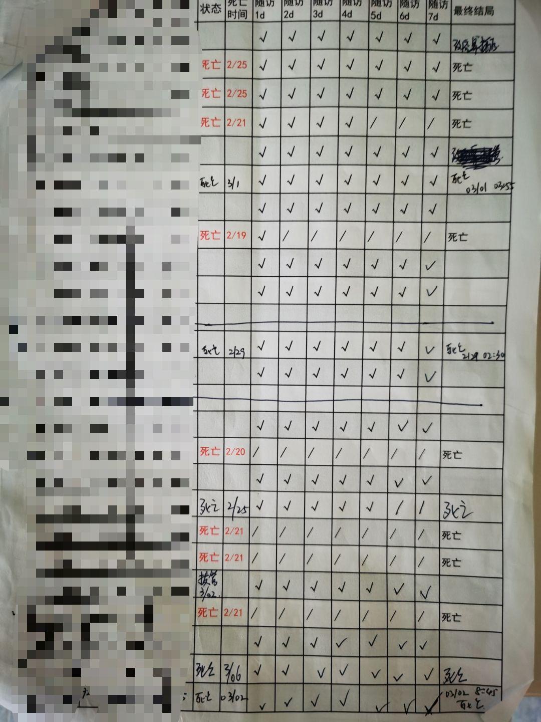 这是我们插管病人的随访表(部分),可以自己看看,随访到第七天,还有多少人活下来。
