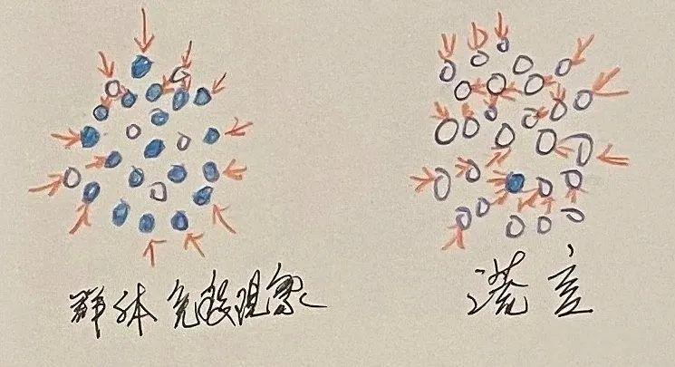 左图中蓝色代表接种过疫苗的人,他们人数多,间接堵住了病毒不传染到没有接种疫苗的人。 右图蓝色代表少数天然有抵抗力的人,他们不可能堵住病毒在人群的传播。红色代表病毒进攻路径。