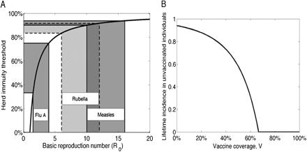 考虑最简单的情况,抗体的有效率为100%,即E=1时。结合 R_0 的定义,如果人群中免疫的个体足够多,导致平均一个感染者传染不到一个人,那这个病不就渐渐消退了么?