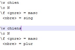 -> On enrichie la base lexical de nouvelles entrées pour rendre compte des variations morphologiques de certains lexèmes. Deux types de variations existent, qu'il faut spécifier dans la description de chaque entrée :