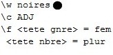 Ensuite, on donne aux traits "genre" et "nombre" figurant dans les deux fichiers un attribut de niveau supérieur appelé "tete", et ce, pour unifier les phénomènes d'accord liés aux trois catégories de mots pouvant former un syntagme nominal :